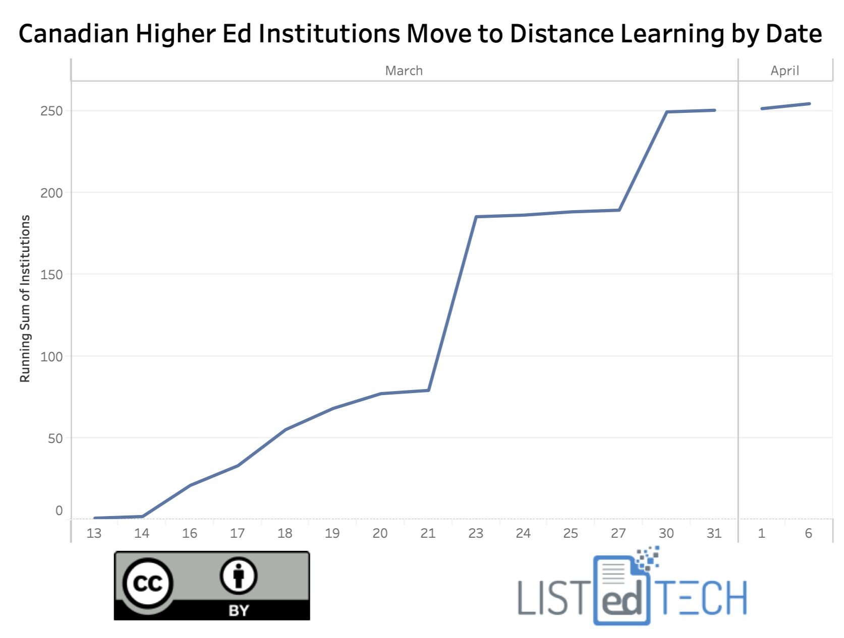 We looked at 400 Canadian higher education institution websites to try and document how they reacted to the COVID-19 epidemic and found information for almost 300. Some of the 400 are already 100% online so the impact was minimal for them. The others, however, had to decide how to proceed.