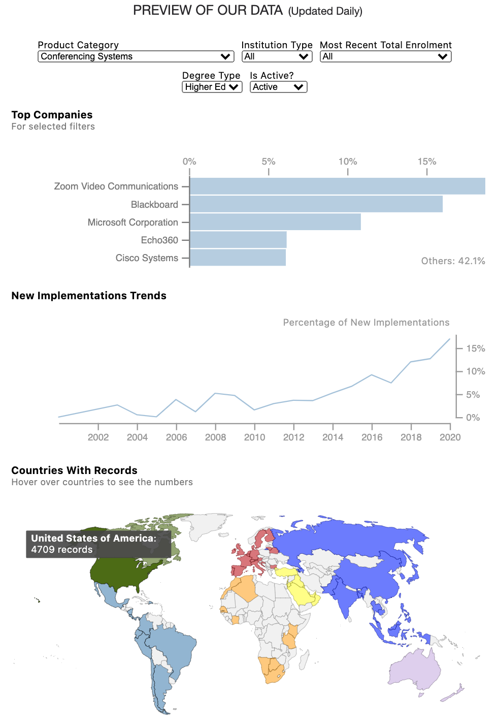 Most Recent Total Enrolment: Degree Type: Is Active? | Product Category -Alert Notification -Business Intelligence – BI -Career Readiness Solutions -Conferencing Systems -Customer Relationship Management – CRM -E-Portfolios -EProcurement -Faculty Information Systems -Financial Aid -Financial Systems -Grants -Human Resources – HR -Learning Analytics Platforms -Library Information Systems -Learning Management Systems – LMS -Massive open online course – MOOC -Online Program Management -Proctor Systems -Retention Management -Student Information System – SIS |