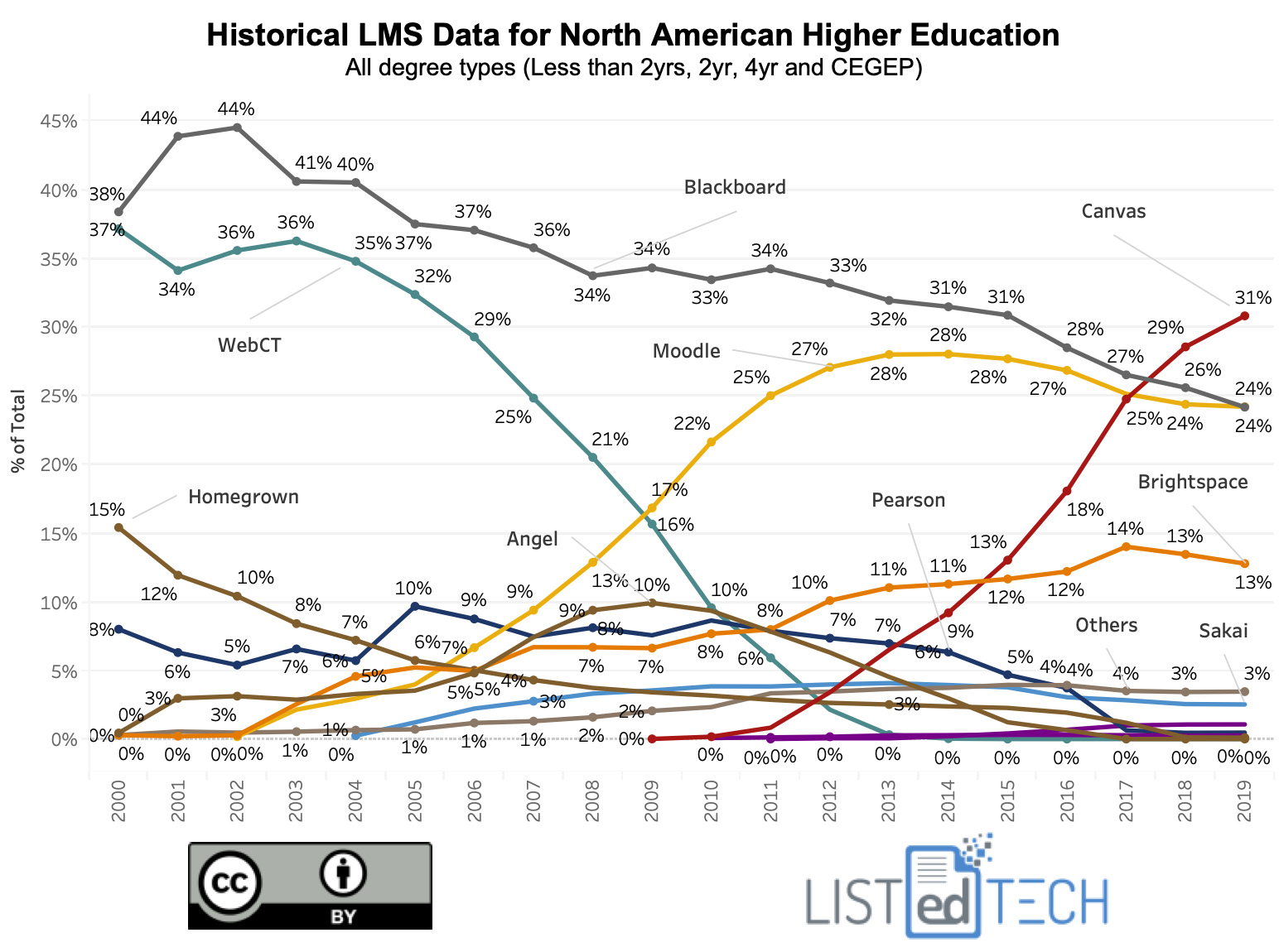 The following data is ‘by institutions’ with market share as a percentage of the total number of institutions. Each counted LMS is a primary system for any higher education institutions in North America (CEGEP, Less than 2yrs, 2yrs, and 4yrs).