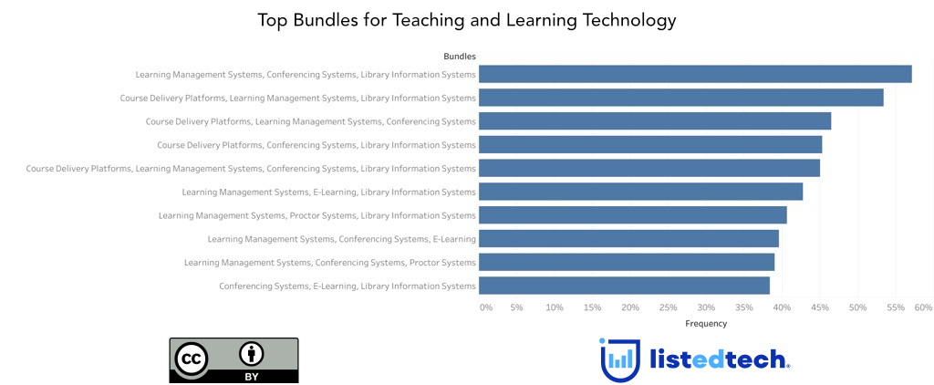 Understanding how institutions arrange their ecosystems is challenging, as many factors are at play, such as integration challenges, stakeholder interests, etc. Yet viewing technology bundles does provide some insight into these ecosystems, revealing likely patterns as the prevalence of learning management systems and unlikely ones (library management systems and the LMS, for example).